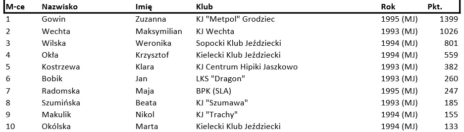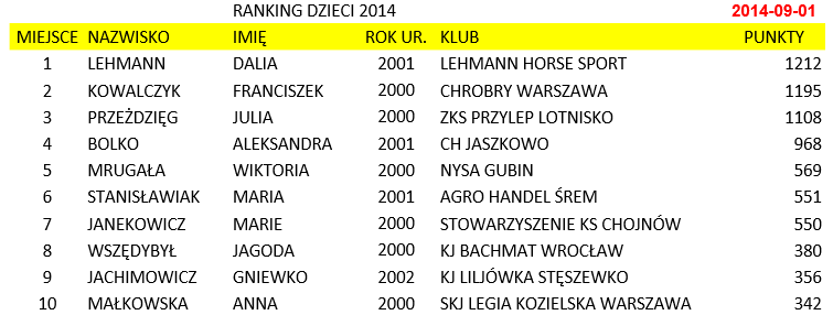 RANKING MŁODZI JEŹDŹCY PZJ na dzień 31.08.14