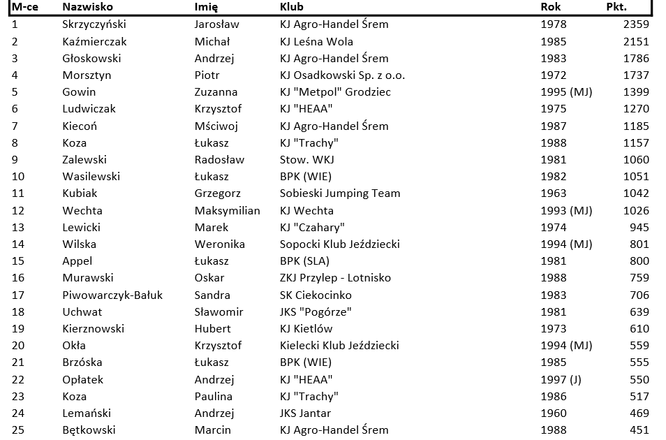 Liderem Rankingu Polskiego Związku Jeździeckiego na koniec sierpnia jest Jarosław Skrzyczyński. Do pierwszej 10-tki na piąte miejsce awansowała Zuzanna Gowin oraz powrócił Radosław Zalewski i Łukasz Wasilewski.