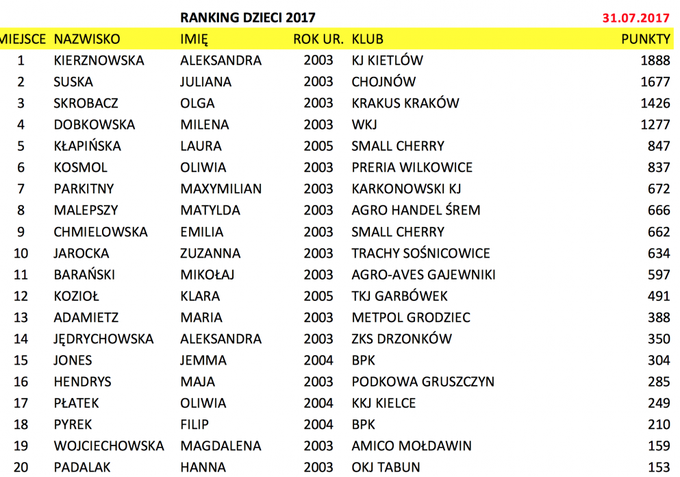Ranking PZJ Dzieci Kuce na koniec lipca 2017